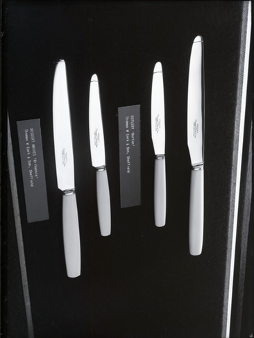 Figure 2 top-left) original image with negative number 1748-O (©CoID) Design Council Archive, University of Brighton Design Archives, top-right) 1748-O (©CoID) image with object identification with YOLOincluding 'knife' labels that describe the object and the confidence value. Bottom-left) original image 1755-O (©CoID) Design Council Archive, University of Brighton Design Archives, bottom-right) 1755-O (©CoID) image with object identification with YOLOincluding 'chair', 'dining table' and 'book' labels that describe the object and the confidence value.